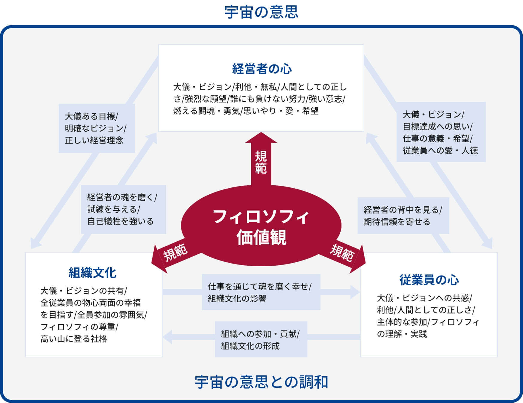 稲盛経営では、経営者の心、従業員の心、そして組織文化が互いに共鳴し合い、相互に影響を及ぼすことで全体が高まっていく構造が強調される。