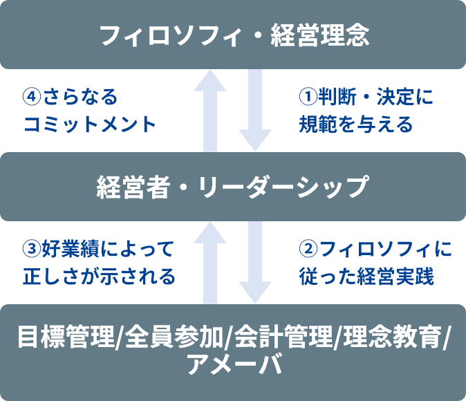 経営者が中心となってフィロソフィ・理念を精緻な経営システムを通じて実践に反映させることが不可欠とする。理念が単なる理想論で終わらず、具体的な仕組みとして実践に落とし込まれることで、高い業績が生まれる。
